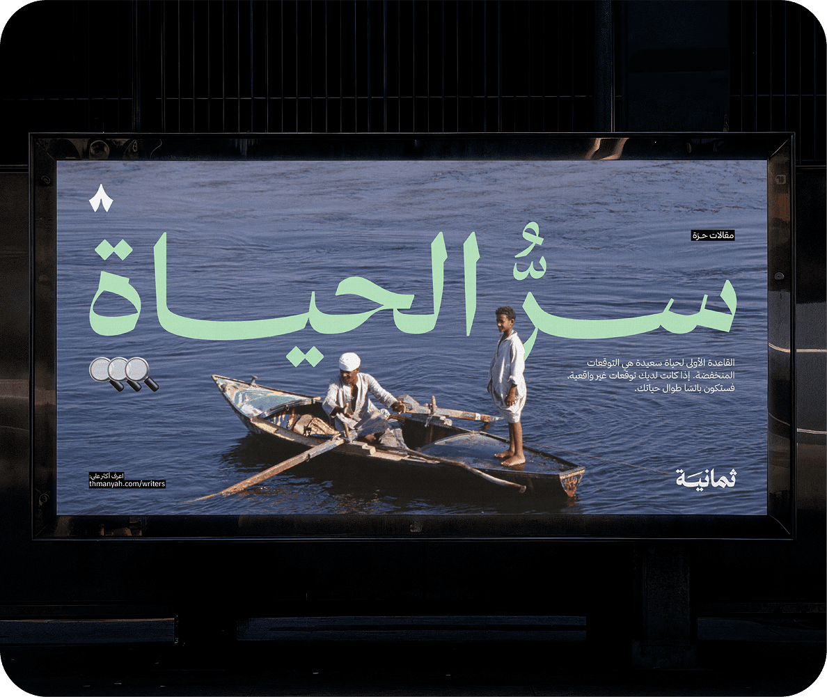 الخط هو العامل القادر على تحويل أي تصميم إلى تحفة فنية، أو إلى قبحٍ مطلق. لذلك، قبل سنتين من الآن، عزمنا على أن نثري المكتبة العربية على الإنترنت بخطٍّ عربي جديد. خط يجمع بين الأصالة والأناقة، والفعاليّة ومتطلبات العالم الرقمي. خط مرن وحيّ، يجمّل كل ما يكتبه. طوّرناه لنكمل به مسيرة ما بدأناه من إثراء المكتبة العربية، بمحتوى نوعي، ومنتجات تقنيّة فريدة. ويكون امتدادًا لقصّة ثمانية وسعيها لإثراء المحتوى العربي شكلًا ومضمونًا.